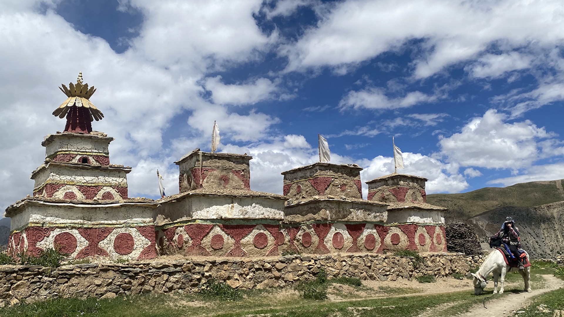 Please note that a large landslide affected this route in 2018 so there may well be some diversions from the written itinerary for the walk between here and Ghami. You leave the campsite and head eastwards, keeping the river on your right. It's a very gradual descent for a couple of hours and easy going trekking. Eventually, you head down to the Ghami Khola and you'll need to don your sandals to wade across the river. At its widest, it's shallow so you're unlikely to get your knees wet! After this you climb up the bank and continue walking eastwards. It's likely you'll enjoy your lunch half an hour or so after your river crossing. You then ascend for a while on a good path (narrow in places) and traverse across the hillside. Eventually you reach the highest point, adorned with prayer flags and a large cairn. From here you have wonderful, inspiring views of Mustang and the snow-capped peaks beyond. From here it's all downhill to your campsite, gradual at first, and then very steep. You will also need to negotiate a small boulder field before regaining a good path that meanders around the hillside. The scenery becomes ever more dramatic with steep sided gorges, cascading waterfalls, giant rock pinnacles, and an ever present view of Mustang to tantalise you.